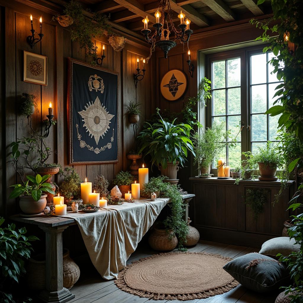 Dit is een serene intieme binnenruimte. De ruimte bevat een altaar met kaarsen, kristallen en kruiden, omgeven door planten en zachte verlichting. Er is een comfortabele zitzone voor meditatie en praktijk. De muren zijn versierd met symbolen en kunst, en er is een raam dat natuurlijk licht binnenlaat, wat de ruimte een vredige en inspirerende sfeer geeft.