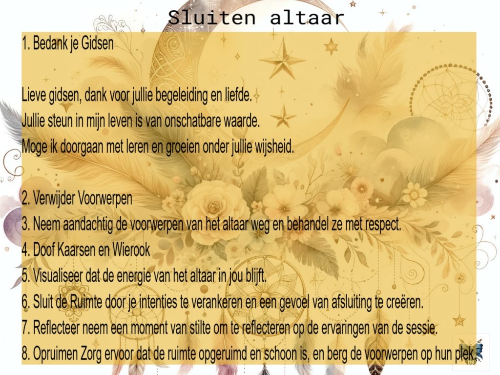 Ook heb ik een ritueel waarbij ik de plek ( altaar) open en weer sluit. Het ritueel bereid je geestelijk voor op andere taken en helpt je focus te verleggen en je intenties duidelijk voor te stellen en te uiten.