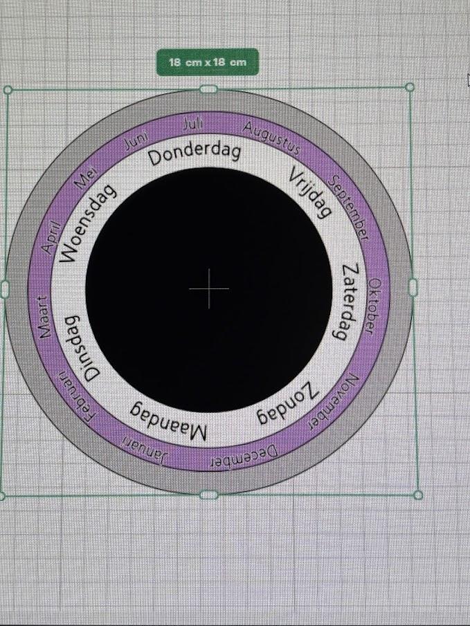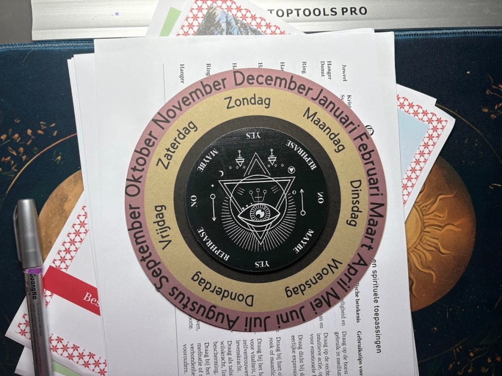 Een van mijn hobbies is creatief zijn met papier. Voor het pendelen had ik eerst een pendelmat opgezocht op Pinterest en die afgedrukt en gelamineerd. En dat systeem werkte goed maar ik was toch niet echt tevreden. Toen ik online een pendel zag, die me leek te roepen, heb ik die aangekocht en erbij kwam het middelste van de cirkel, het zwarte dus. Maar omdat ik ook soms tijdsgebonden vragen stel, vond ik dat de weekdagen en de maanden ook hun plaatsje moesten krijgen in het geheel.