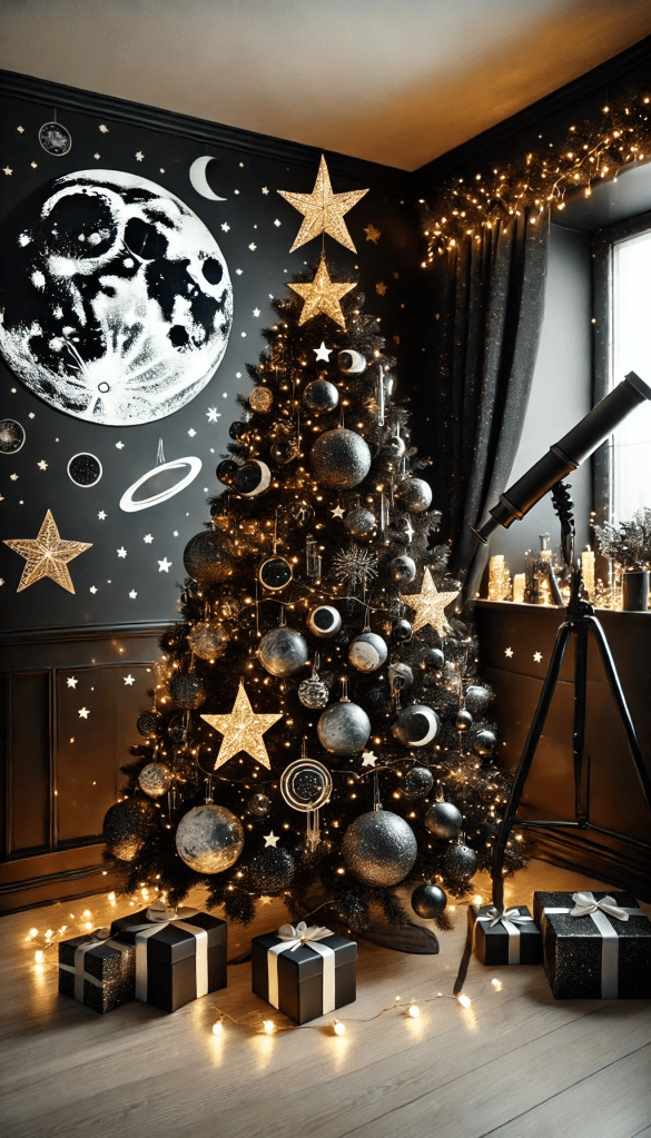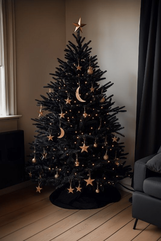 Ook de aankleding van je kerstboom kan perfect in een heksenthema. Enkele voorbeeldjes.
